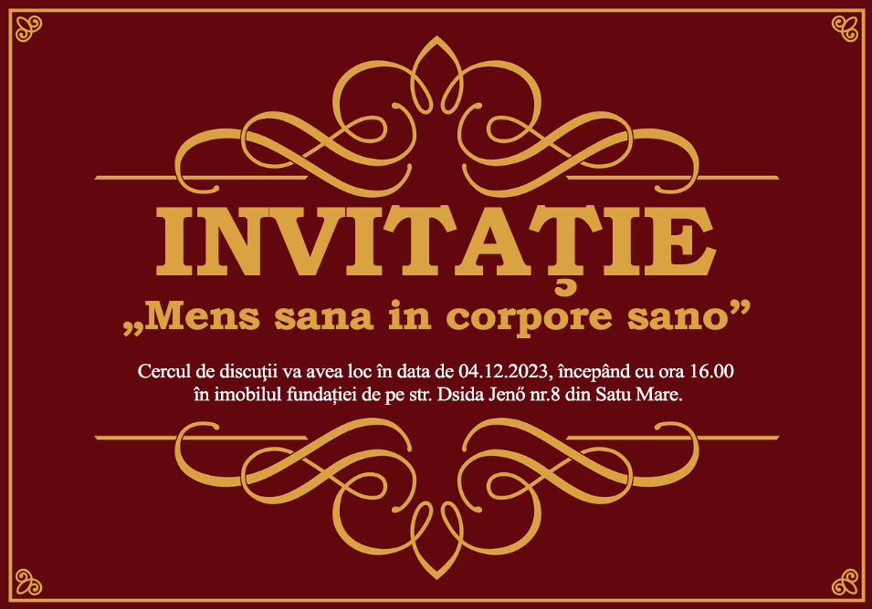 Az esemény időpontja 2023.12.04, helyszín Szatmárnémeti, Dsida Jenő utca, 8 szám, 16.00 órai kezdettel.